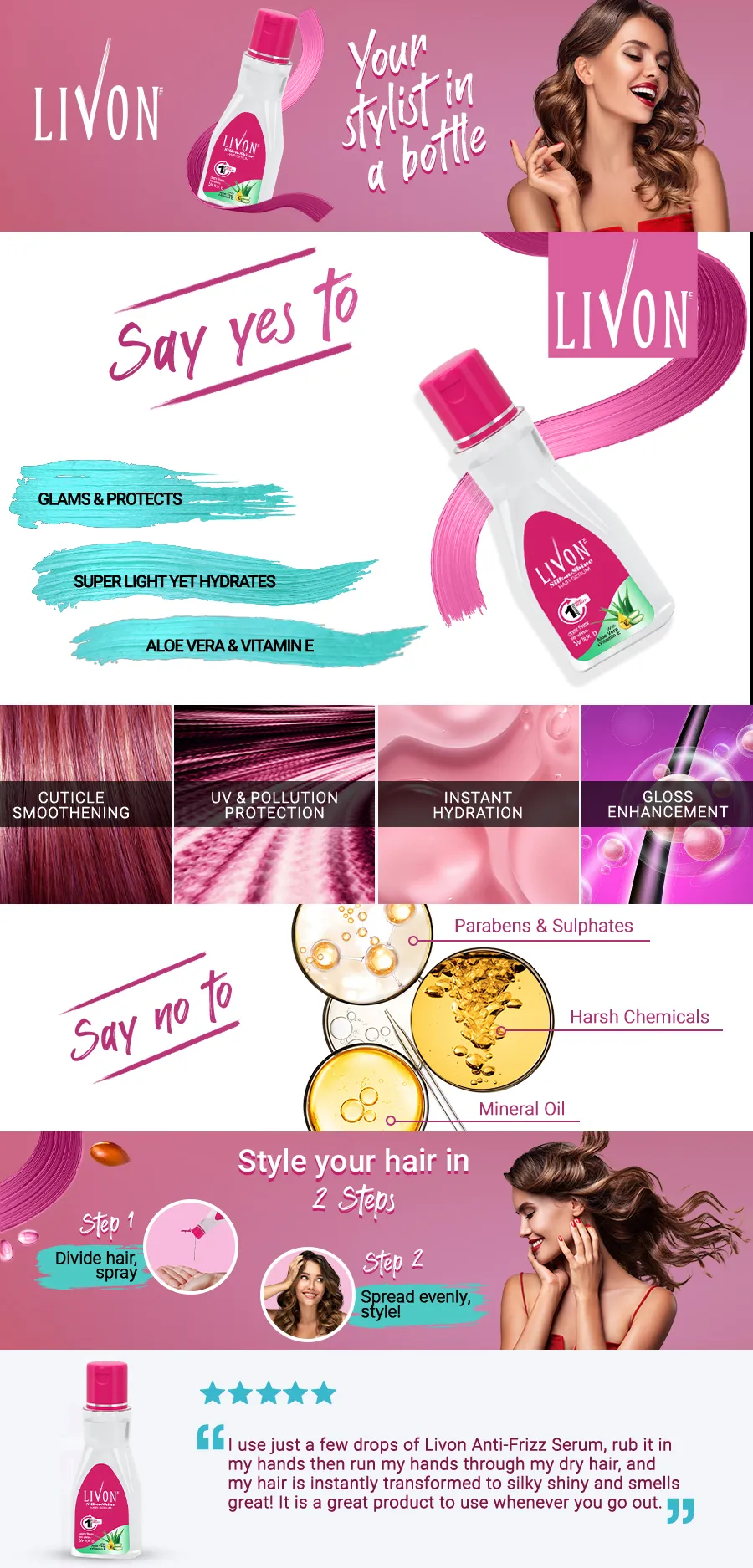 Livon Damage Repair Shampoo has the goodness of Almond Oil and Argan Oil that help repair hair damage and makes it smooth and shiny. How to use: Thoroughly wet your hair. Pour into your hand and massage gently into hair and scalp. Rinse thoroughly. Repeat if necessary. Ingredients: It has the goodness of Almond Oil and Argan Oil Storage: Store in a cool and dry place. For external use only.
