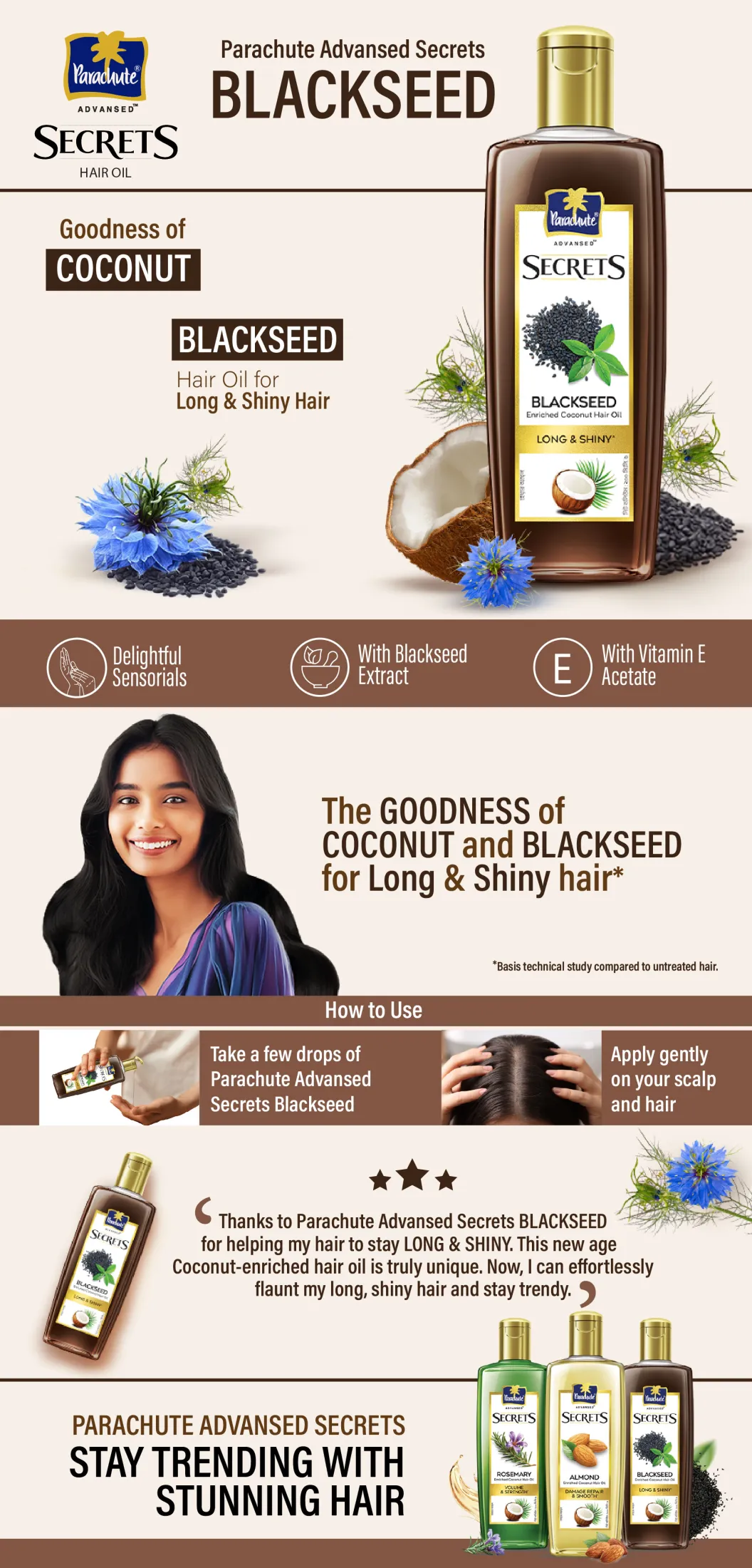 Introducing Parachute Advansed Secrets - a collection of nature’s best-kept secrets and exotic ingredients in hair care. A unique blend of Blackseed Extract with nourishing coconut oil gives you Long & Shiny Hair. Key Ingredients: • Blackseed Extract • Coconut Oil • Mineral Oil • Perfume • Vitamin E Acetate.