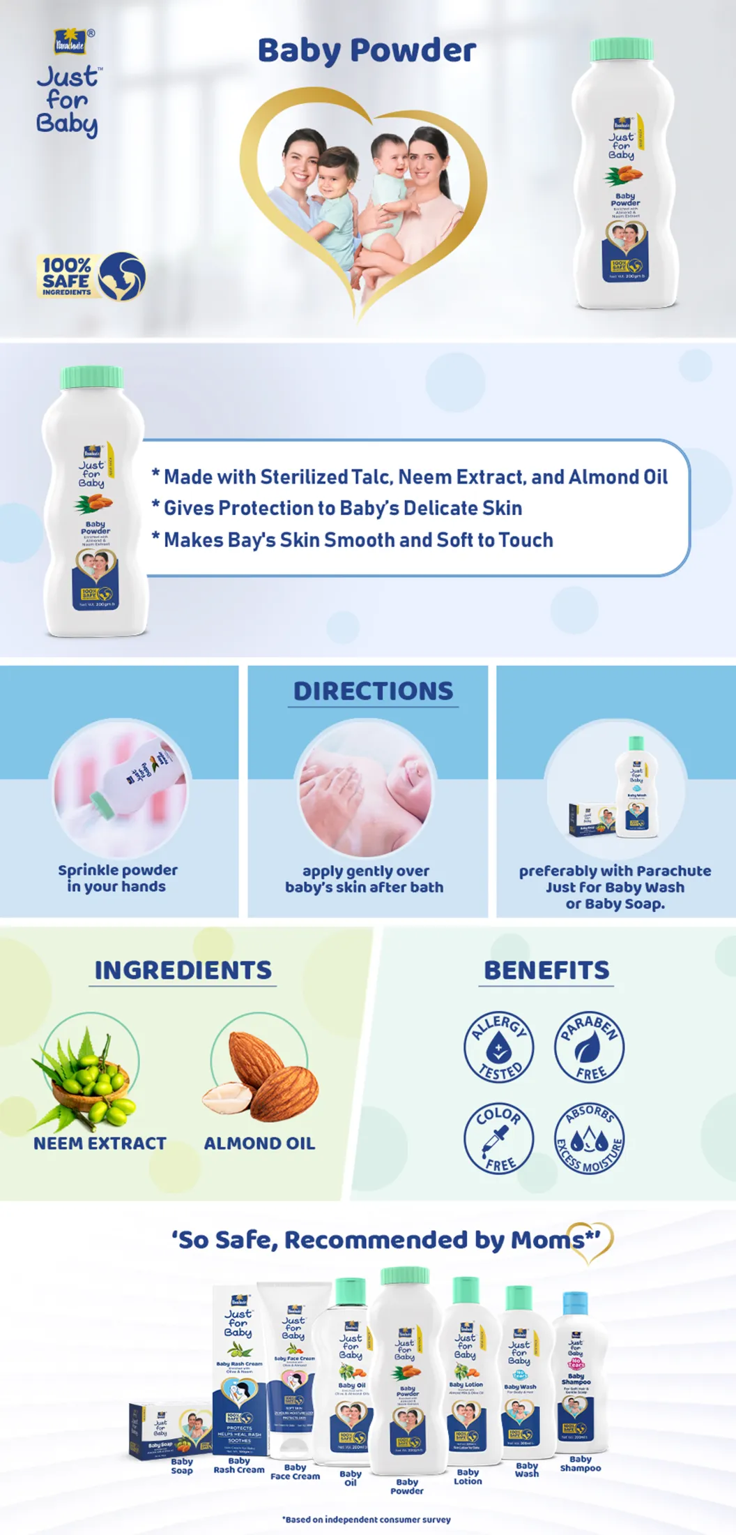 • The Parachute Just for Baby care range is enriched with Paraben Free & Color Free ingredients with 100% natural moisturizers and is Australian Allergy Certified.