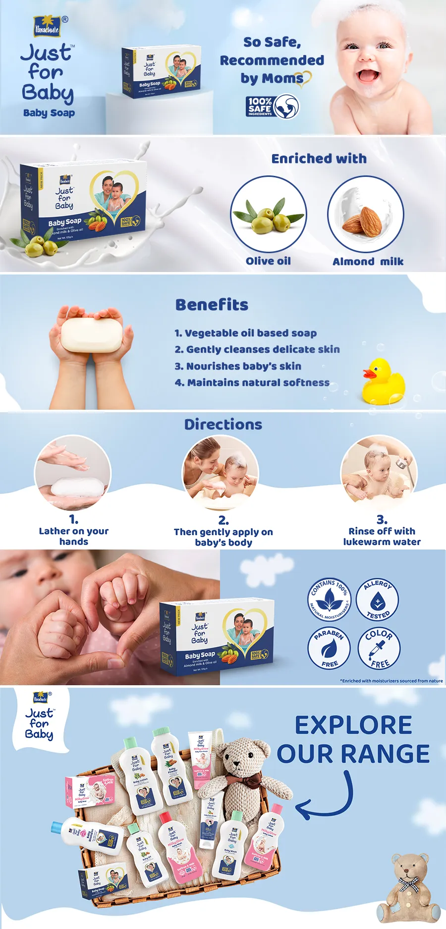 • The Parachute Just for Baby care range is enriched with Paraben Free & Color Free ingredients with 100% natural moisturizers and is Australian Allergy Certified.