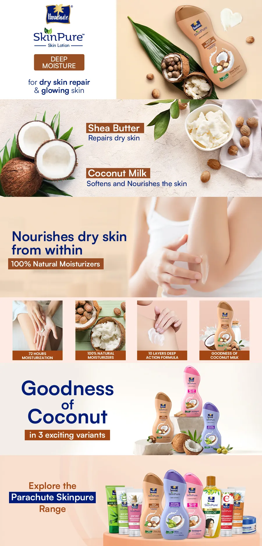 • Parachute SkinPure Deep Moisture Body Lotion: Parachute SkinPure Deep Moisture Body Lotion is a nourishing skincare solution enriched with the goodness of Coconut Milk and Shea Butter, designed to repair dry skin and promote glowing skin.