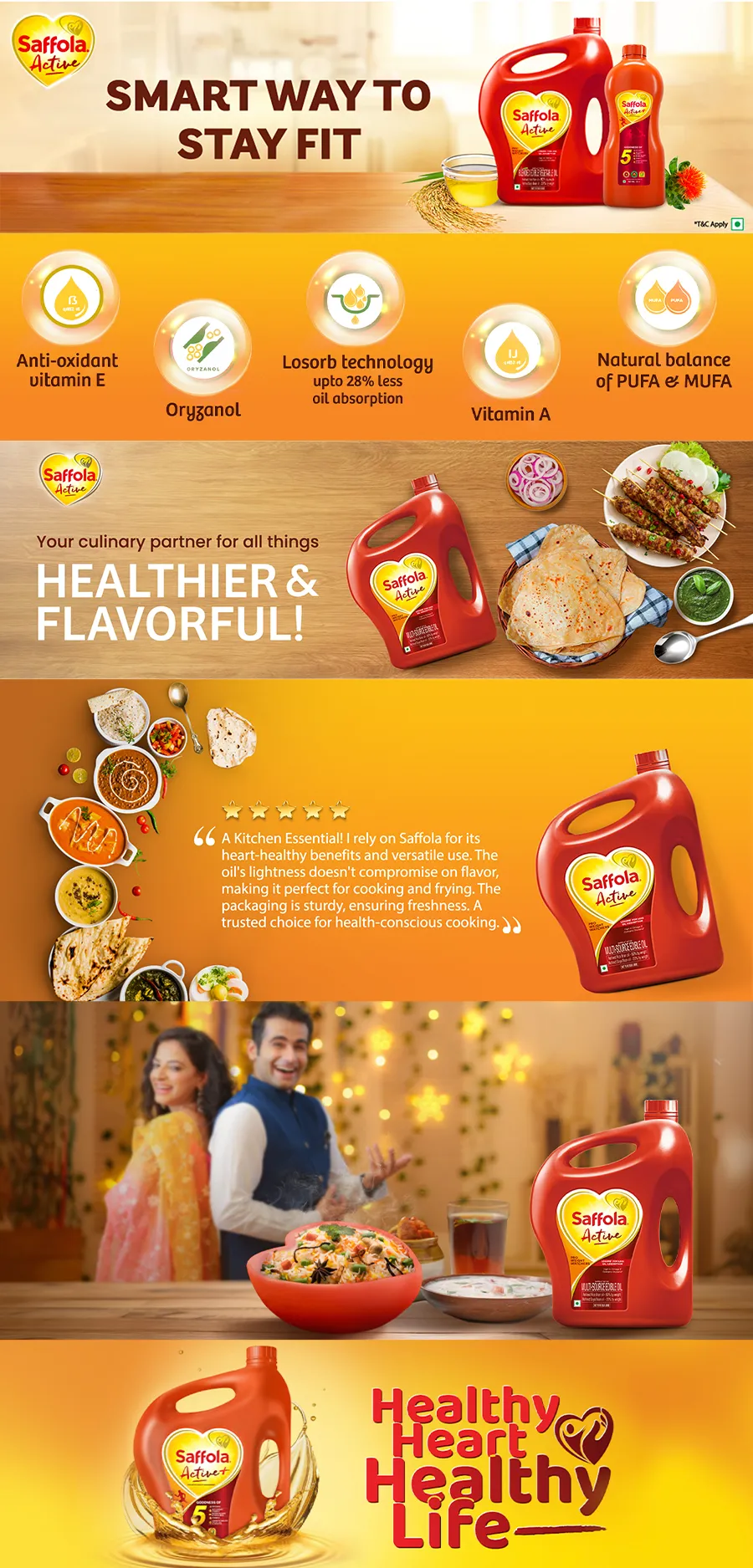 • Saffola Active+ Fortified Edible Ricebran oil is a smarter choice for health and is also great for active life management for you and your family.