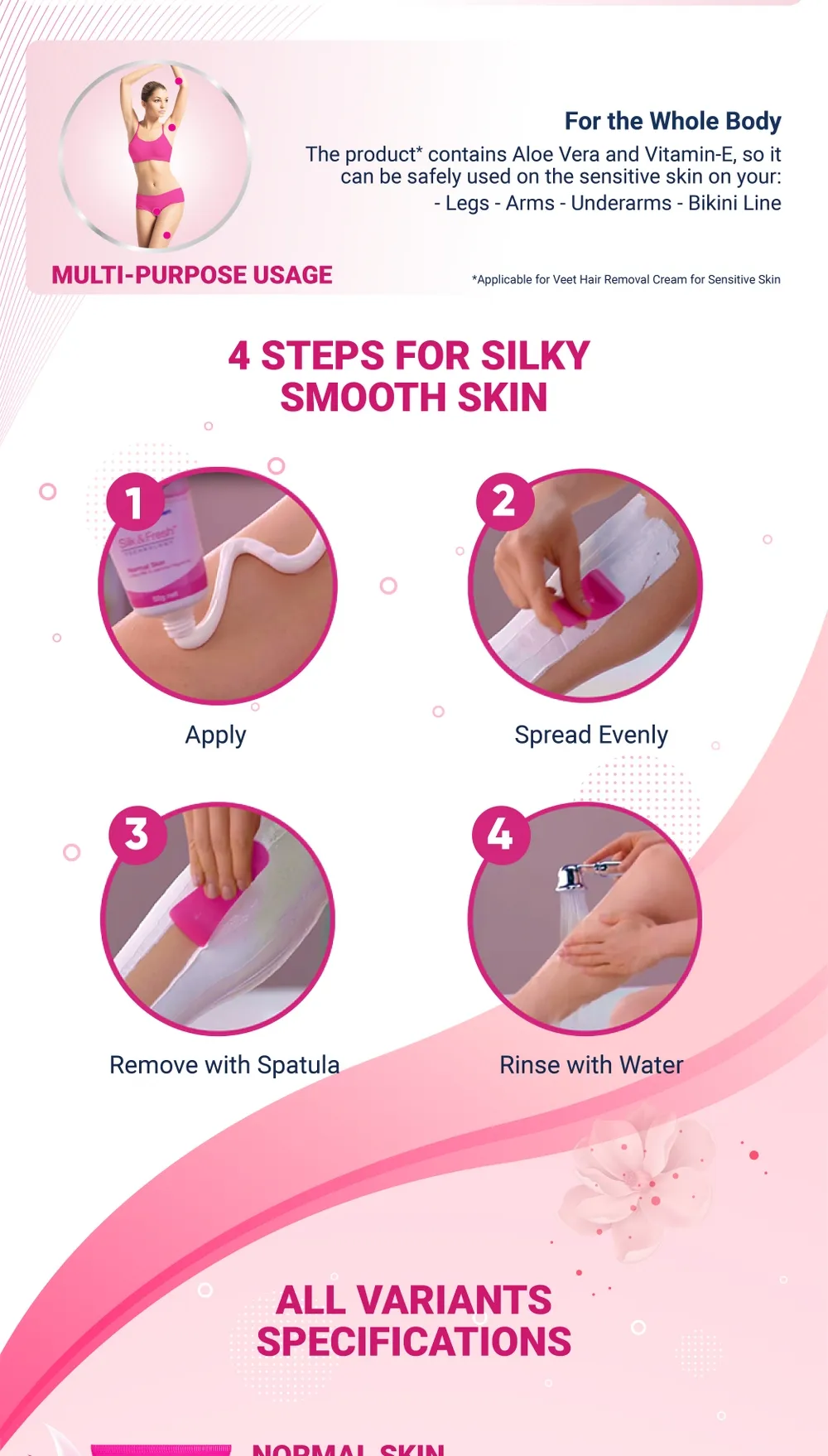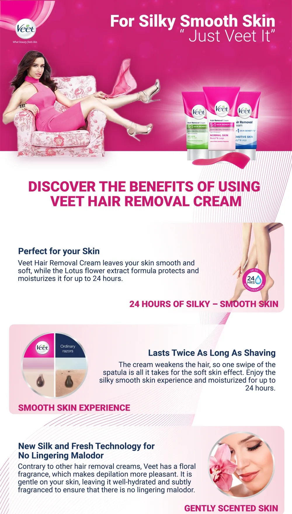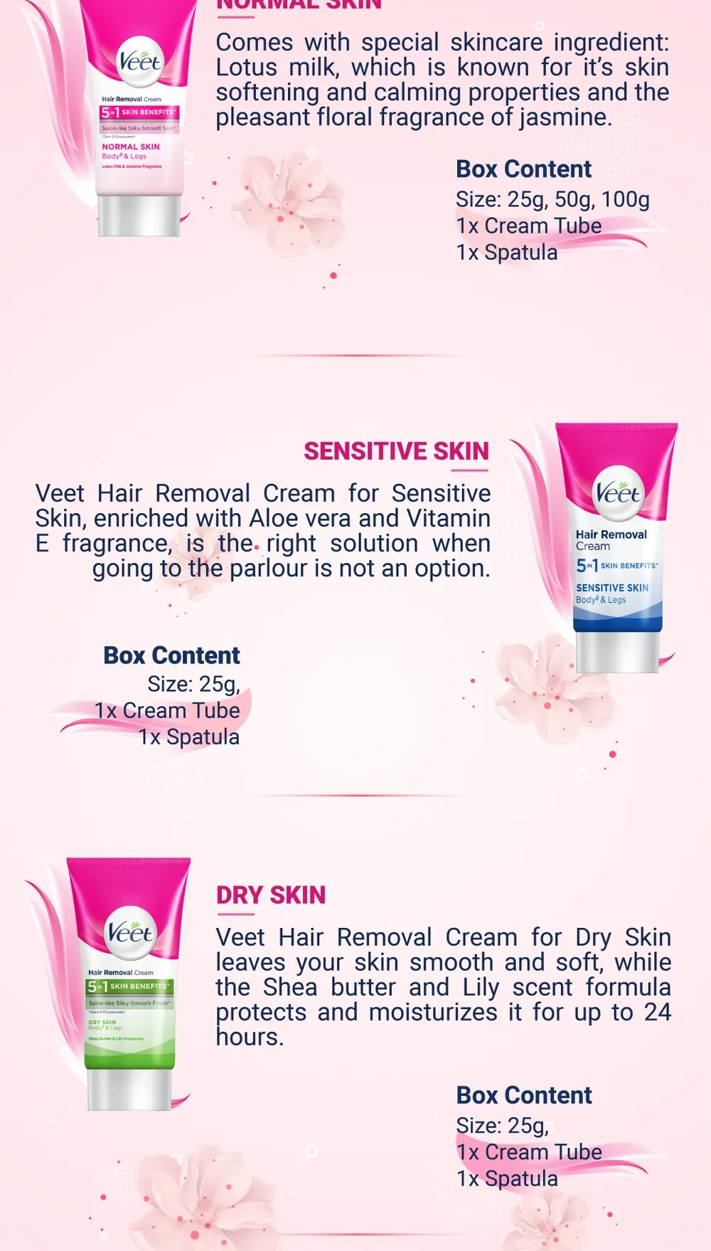Veet Hair Removal Cream for Normal Skin is formulated with Lotus milk that gives salon-like silky smooth skin with 5 in 1 skin benefits : visibly brightens, moisturizes up to 24 hrs, exfoliates, smoothens & leaves pleasant Jasmine fragrance. Veet creams are available for normal sensitive & dry skin.